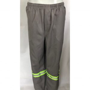 CALÇA TOTAL ELÁSTICO EM BRIM CINZA COM LOGO NO BOLSO TRASEIRO, FAIXA REFLETIVA CINZA 2,5 SOBREPOSTA NA FAIXA VERDE FLÚOR