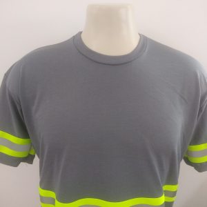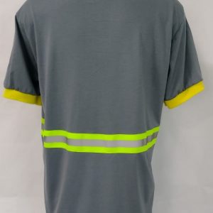 CAMISA POLO MANGA CURTA TECIDO MALHA PV NA COR CINZA COM GOLA E BRAÇADEIRA EM AMARELO, COM LOGO LADO DIREITO E VELCRO LADO ESQUERDO, FAIXA REFLETIVZA CINZA 2,5 SOBREPOSTA NA FAIXA VERDE FLÚOR SOMENTE NO CORPO. PADRÃO VTAL.