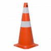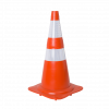 Cone para sinalização de obras e pavimentação nas rodovias, fabricado em polietileno semiflexível, com base de borracha reciclada e faixa refletiva, sendo composto de duas peças (corpo e base), que podem ser substituídas a qualquer tempo.